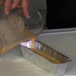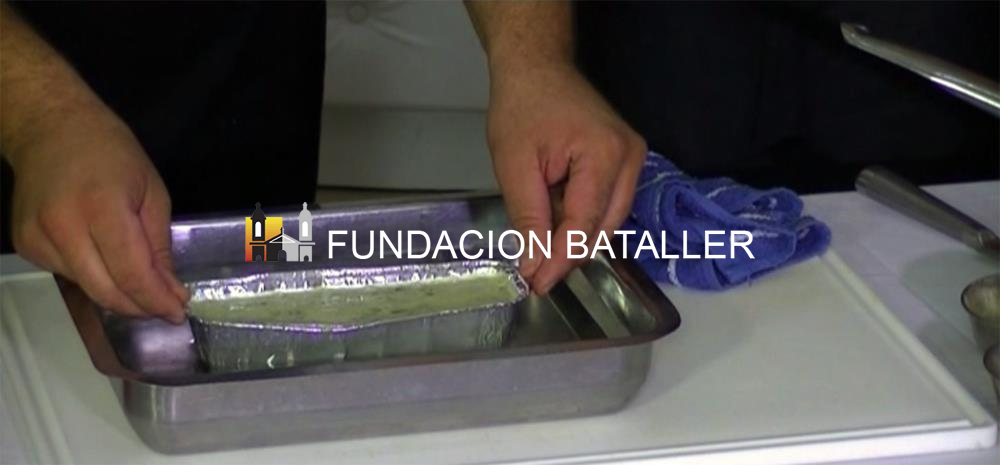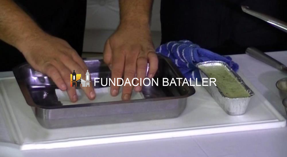 Una vez que colocamos la primera base, se coloca en una fuente de horno, papel absorbente, agua y encima la budinera con el primer relleno. (El nivel de agua debe ser de la mitad de la fuente hacia abajo).