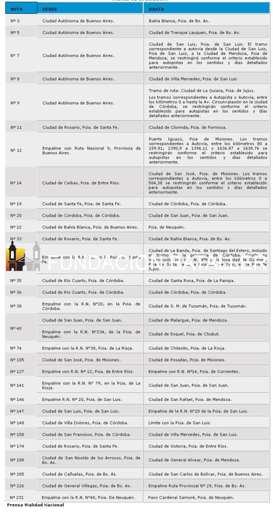La veda regirá en sentido ascendente (salida), el día jueves 25 de diciembre de 18 a 23:59 hs., y en sentido descendente (regreso), el día domingo 28 de diciembre de 18 a 23:59 hs., en los siguientes accesos a CABA, autovías y autopistas: