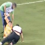 Parece un acto circense pero sucedió durante un partido de la segunda división griega, entre el Larisa y el Ergotelis. Dos auxiliares intentan llevarse a un jugador y lo tratan de muy mala manera.