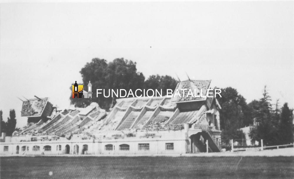 1944 – Daños en el Estadio / El mayor escenario deportivo, el Estadio del Parque de Mayo, también sufrió las consecuencias del sismo de 1944. La foto lo muestra tras la destrucción. La tribuna principal resultó seriamente afectada, derrumbándose la visera y las torres que se observan al fondo. Muchos años pasarían antes de que volviera a ser utilizado. Como dato curioso podemos señalar que en los días que siguieron al terremoto fue utilizado para depositar automóviles destruidos. (Foto publicada en los libros "Y aquí nos quedamos" y "El San Juan que ud. no conoció", de Juan Carlos Bataller; proporcionada por Inge Schwenke de Kummel)