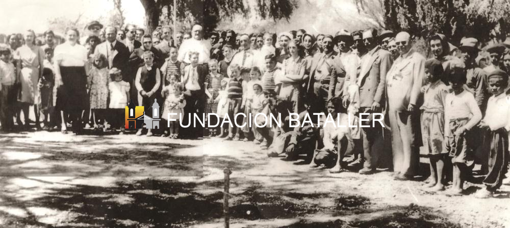 1950 - La plantación de olivos / Don Bartolomé del Bono y su esposa, junto a hijos, nietos y personal de su empresa, en una de las tradicionales plantaciones de olivos que movilizaban a familiares y colaboradores y constituía un hecho formal y solemne. Aparece también una bandera que hacía izar y se entonaba el himno nacional.