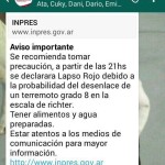 En la tarde de ayer domingo, luego del sismo que se registró a las 18, en los diferentes grupos de Whatsapp un mensaje de alerta que afirmaba haber sido emitido por el Instituto Nacional de Prevención Sísmica (INPRES) y alertaba sobre un alerta rojo, a partir de las 21 por un terremoto de 8 grados.