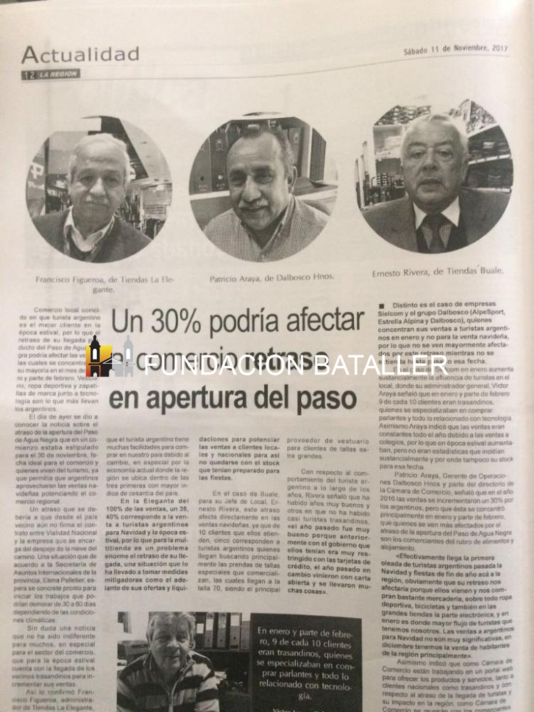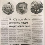 "Un 30% podría afectar al comercio retraso en apertura del paso", tituló el periódico chileno, en una nota a página completa, con las fotografías de Francisco Figueroa, de Tiendas La Elegante; Patricio Araya, de Dalbosco Hermanos; y Ernesto Rivera, de Tiendas Buale.