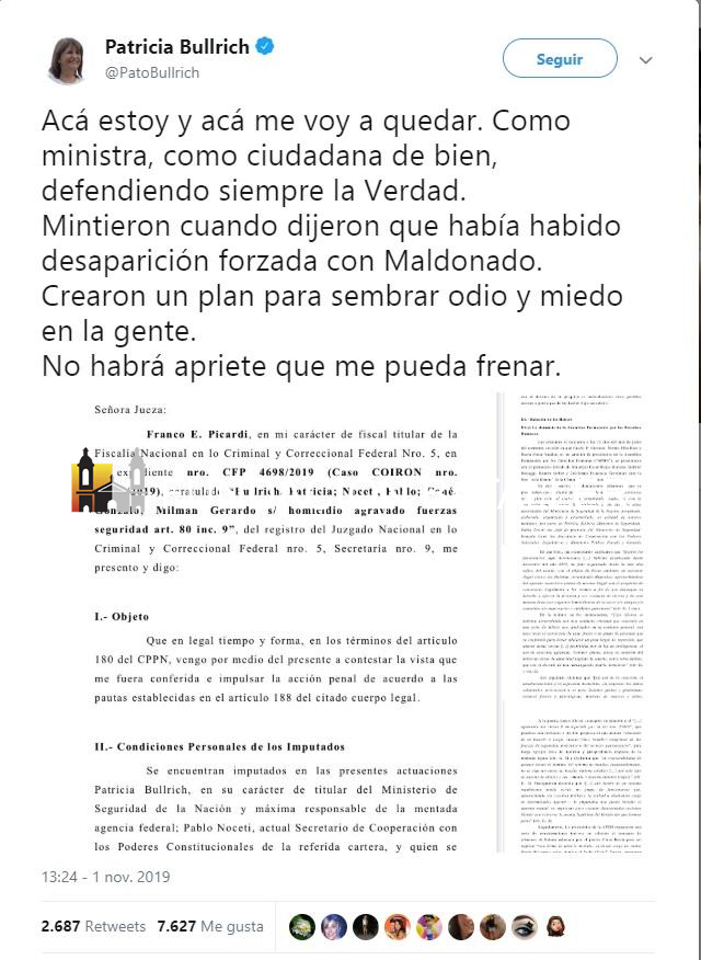 “Acá estoy y acá me voy a quedar. Como ministra, como ciudadana de bien, defendiendo siempre la Verdad. Mintieron cuando dijeron que había habido desaparición forzada con Maldonado. Crearon un plan para sembrar odio y miedo en la gente”, escribió en su cuenta de Twitter.