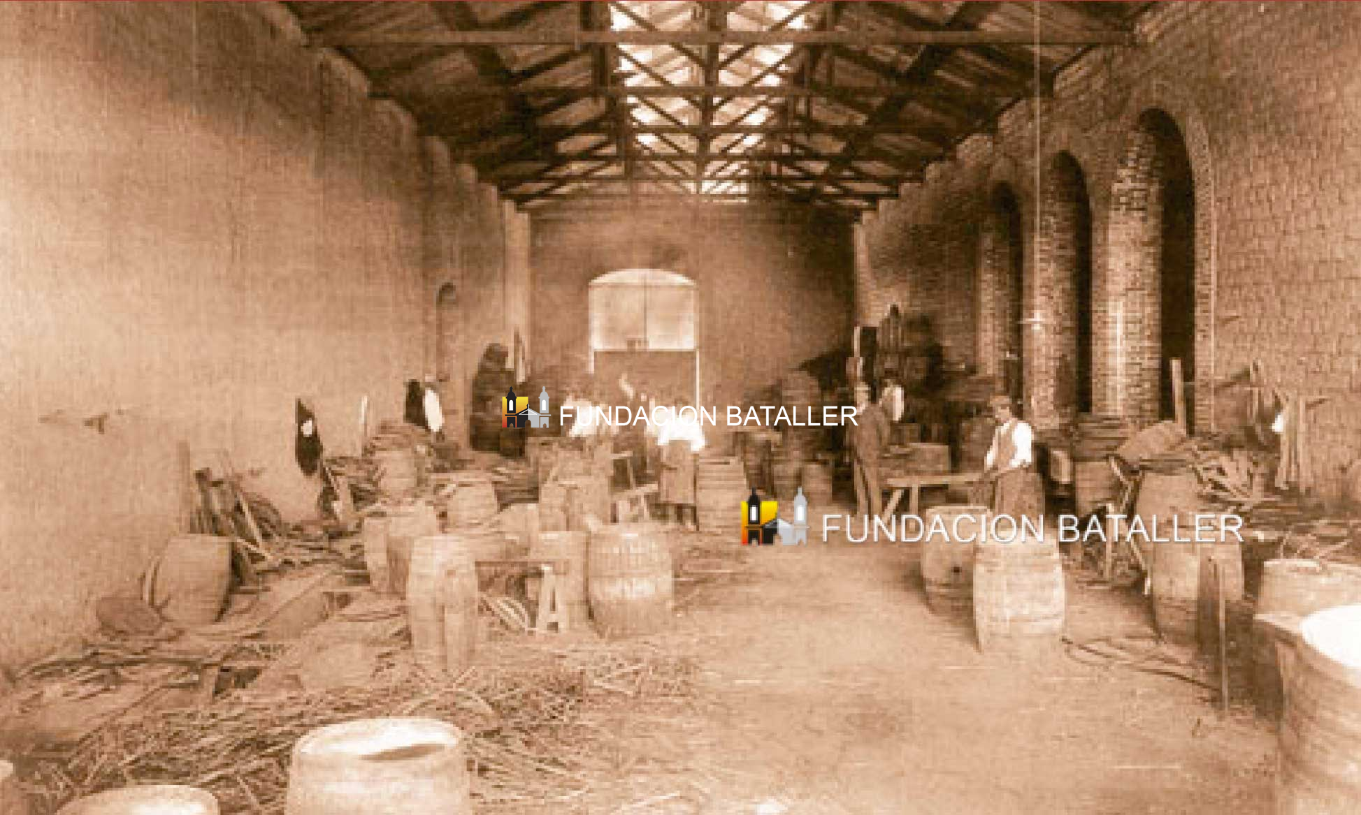 tonelería de la bodega. En el centro de la foto, de traje y sombrero, se