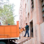 En junio de 2007, con la habilitación de parte del edificio del Centro Cívico, los organismos del Poder Ejecutivo que funcionaban en el Edificio 9 de Julio se mudaron a las nuevas instalaciones. Esta fotografía fue tomada durante la mudanza, que dejó al edificio de avenida Ignacio de la Roza vacío y listo para recibir trabajos de consolidación antes de pasar a manos del Poder Judicial, según se dijo en aquel momento.